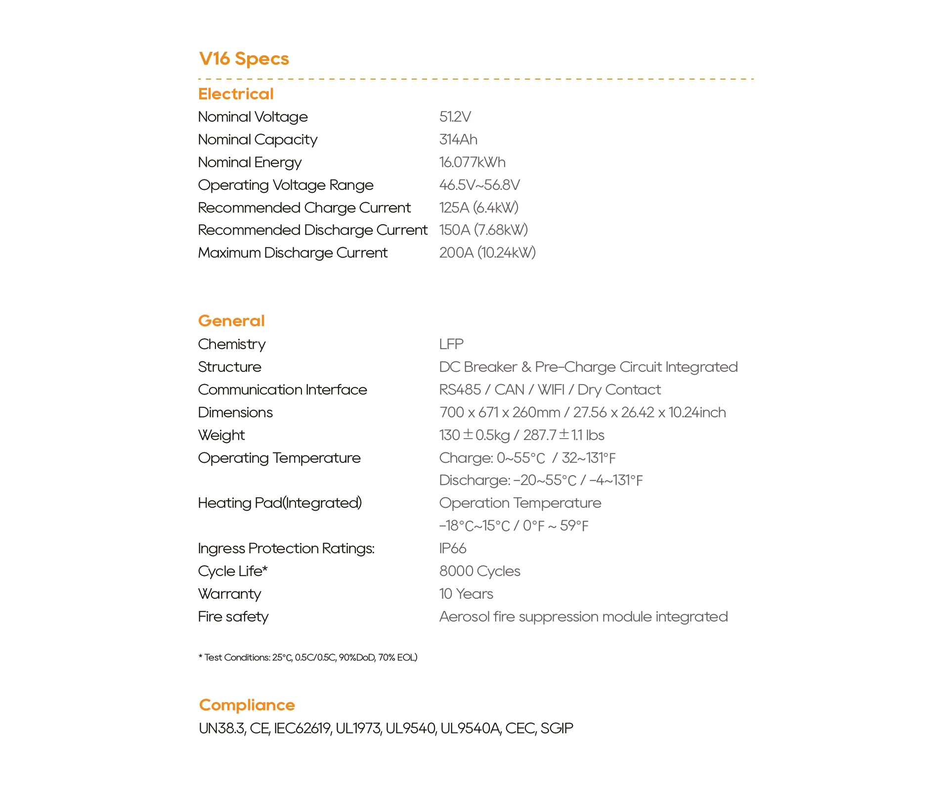 The V16 integrates a DC circuit breaker, pre-charge circuit, and an aerosol fire suppression module, providing multiple layers of protection against electrical faults and thermal events.